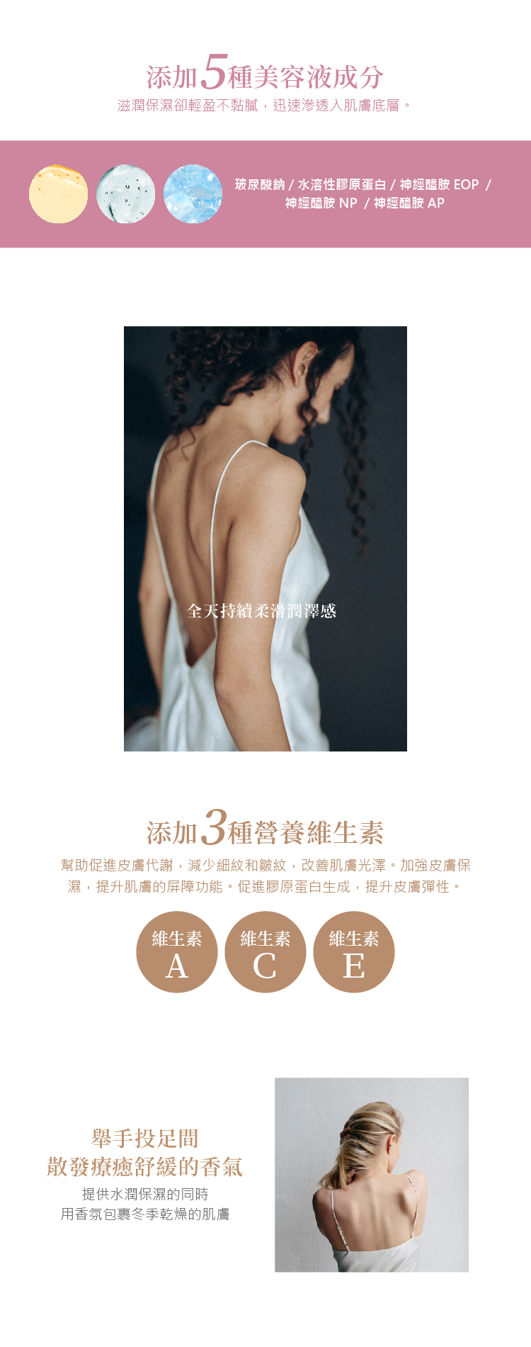 滋潤保濕卻輕盈不黏膩,迅速滲透入允膚底層。